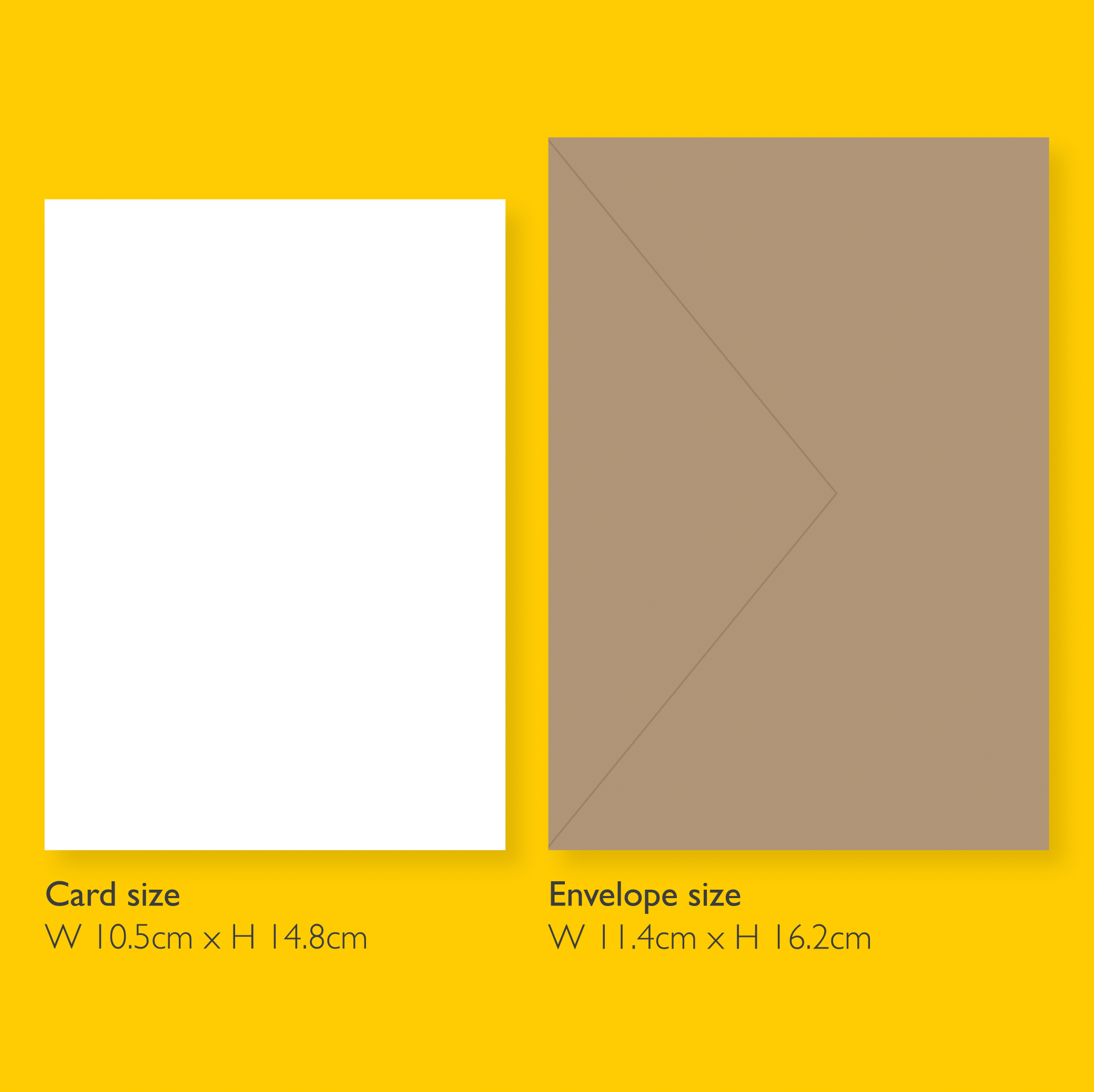 Rectangular card printed on FSC-certified 350gsm card. Card: H148 x W105mm. Brown kraft envelope: H114 x W162mm.
